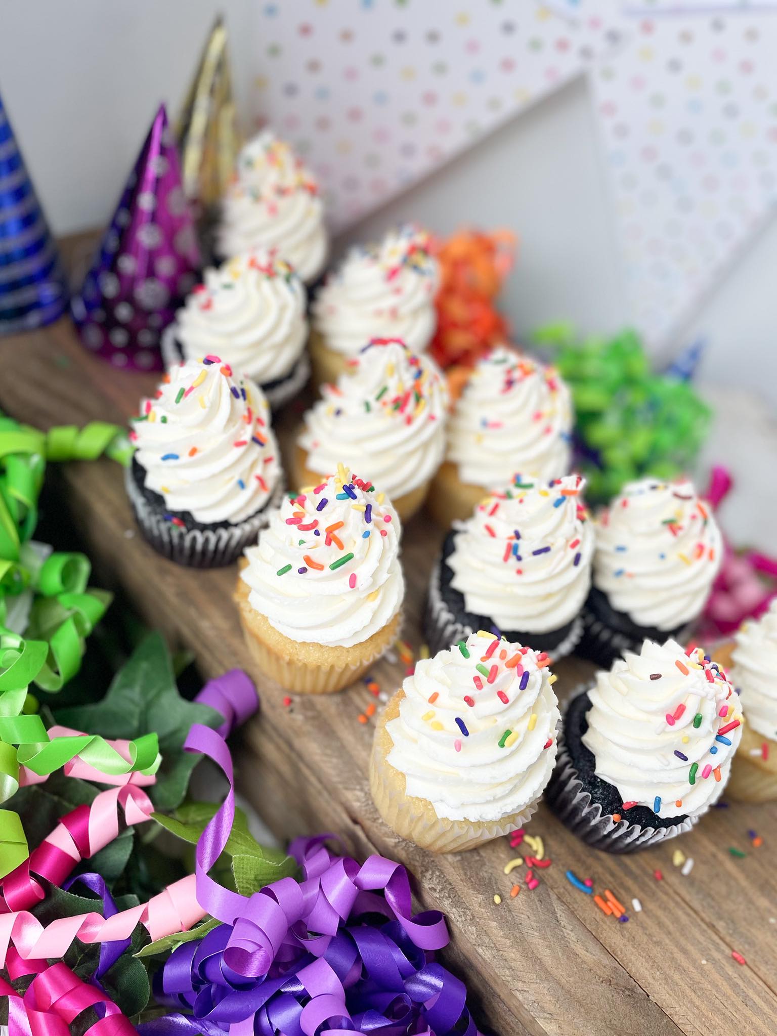 Simple chocolate and vanilla cupcakes frosted with vanilla buttercream and rainbow sprinkles! Basic flavors but still delicious and made from scratch! Sold by the dozen only