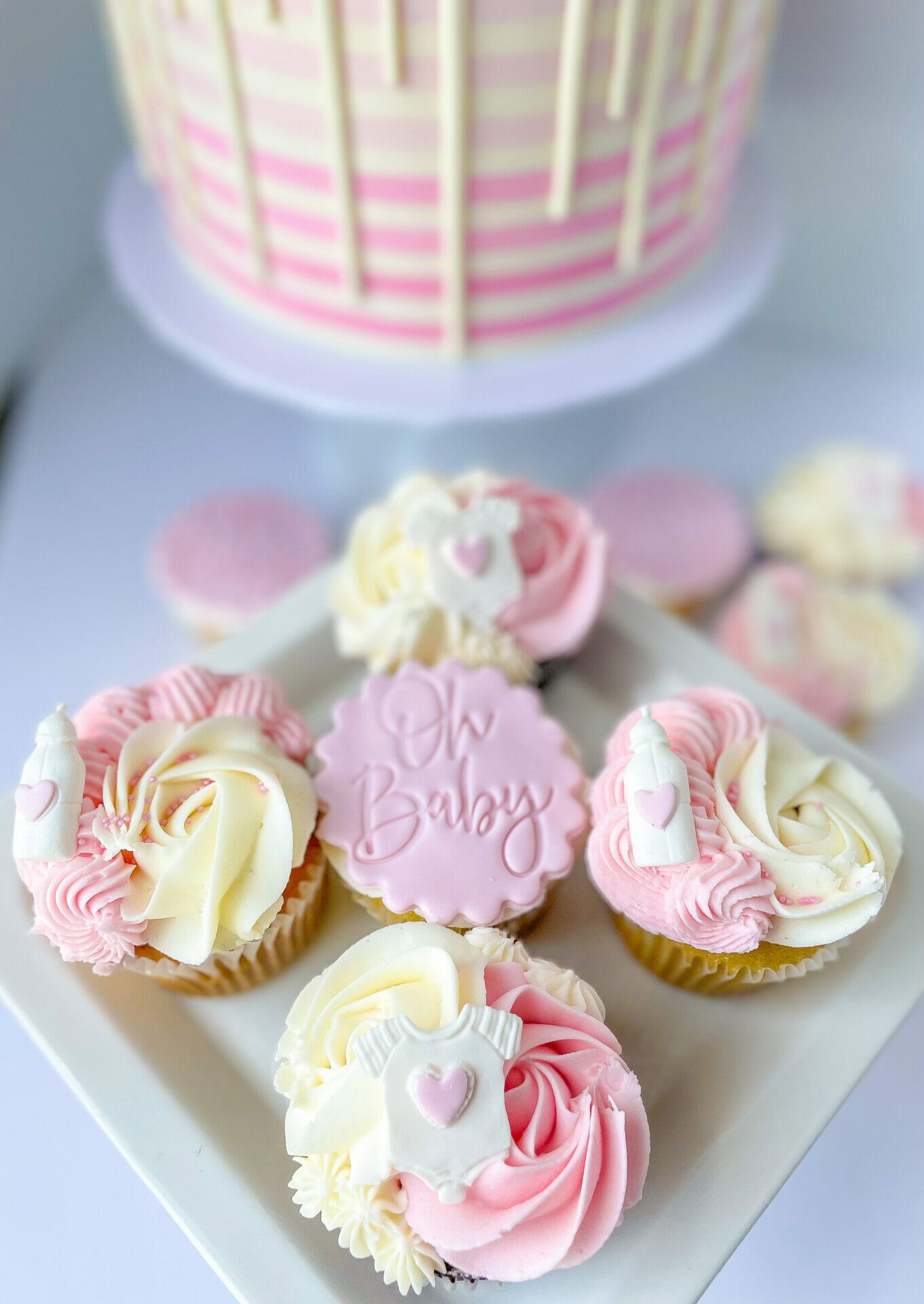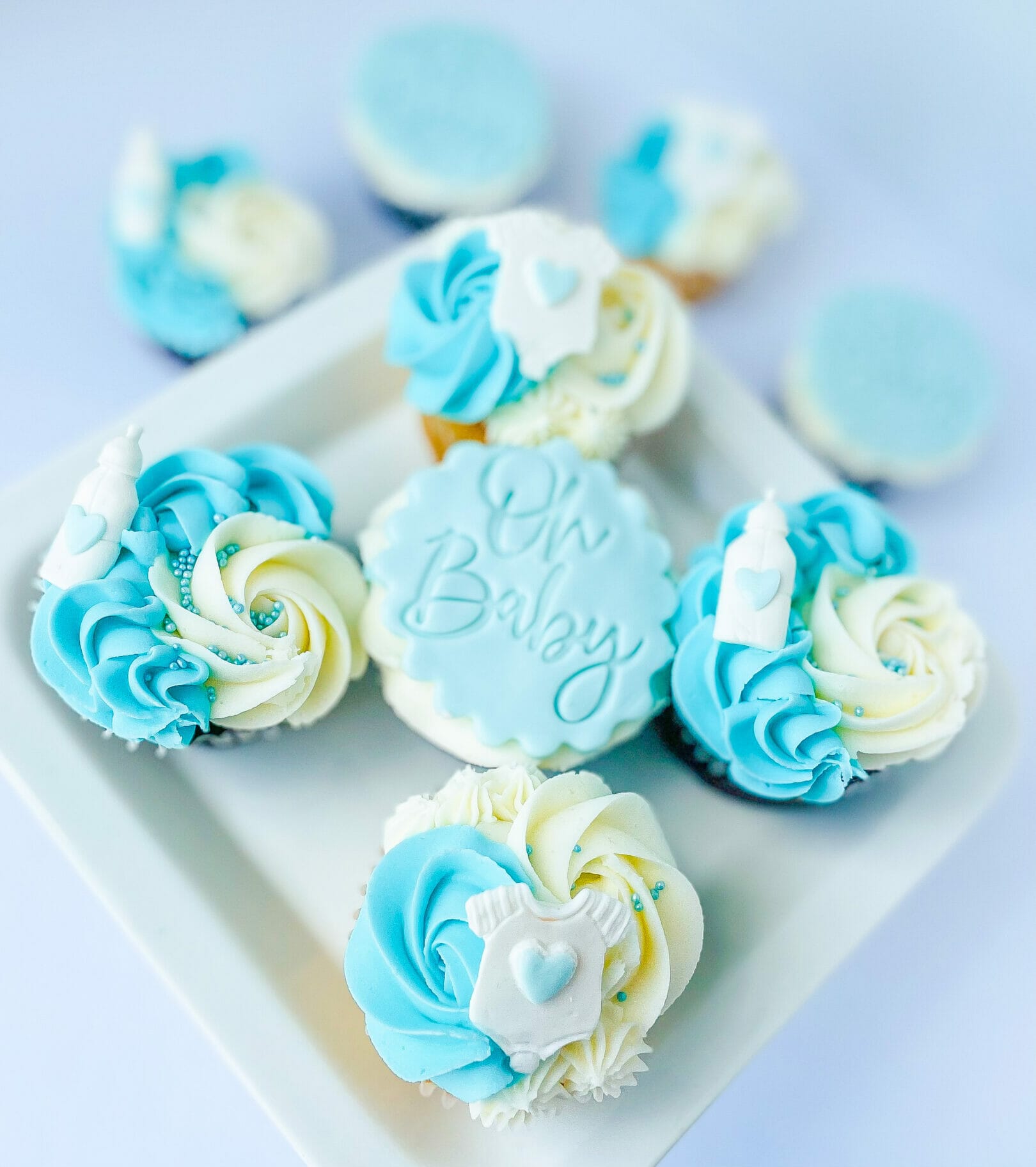 Half chocolate/half vanilla cupcakes with all vanilla frosting. Comes with fondant toppers (bottle, onesie and Oh Baby plaque)
