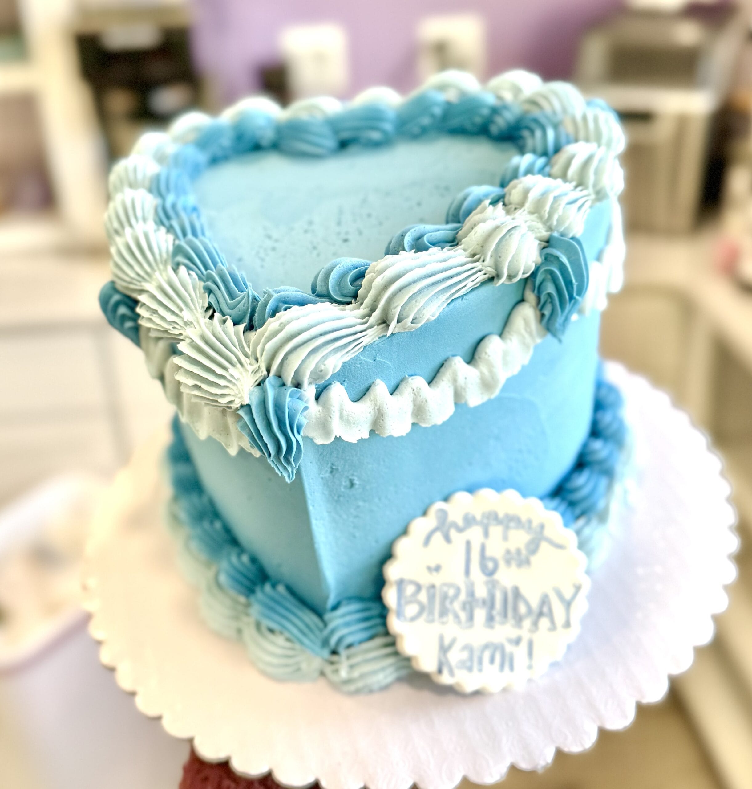 6″ or 8″ heart shaped cake in your choice of flavor and colors. You can customize the message and add cherries if you’d like!